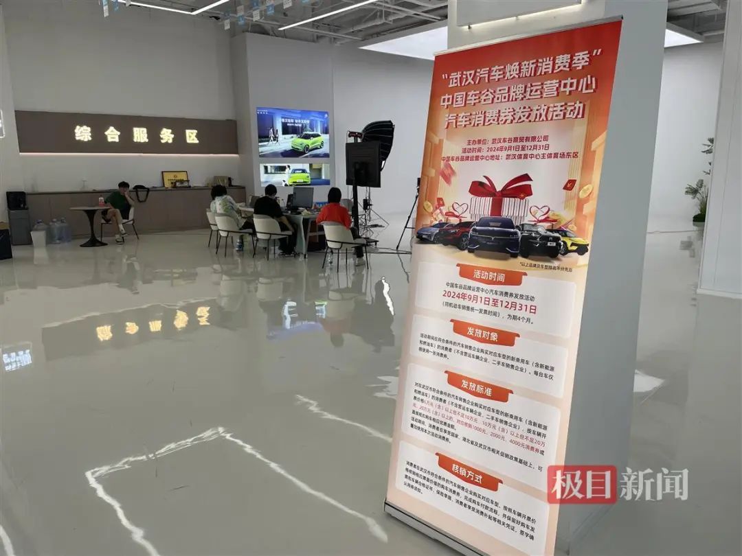 在车谷东风汽车商城直播中心探访时,记者看到,大厅内摆放着“武汉汽车焕新消费季”中国车谷品牌运营中心汽车消费券发放活动的展示架。