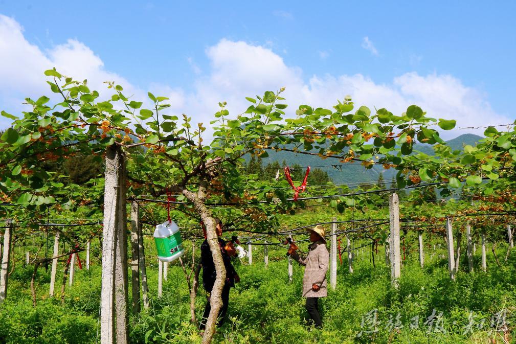 2023年5月,建始县长梁镇龙洞湾村猕猴桃示范基地,村民抢抓晴好天气为猕猴桃进行人工授粉。(资料图)
