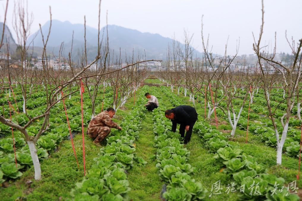 建始县长梁镇白云村果农在梨园套种蔬菜,为增收上好“双保险”。(资料图)