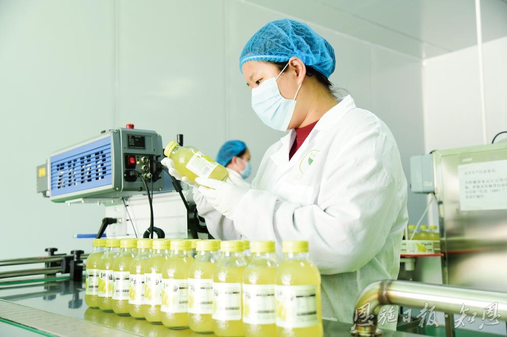 4月7日,富源农业发展有限公司工人正在无菌车间灌装宣恩“轻柚汁”。