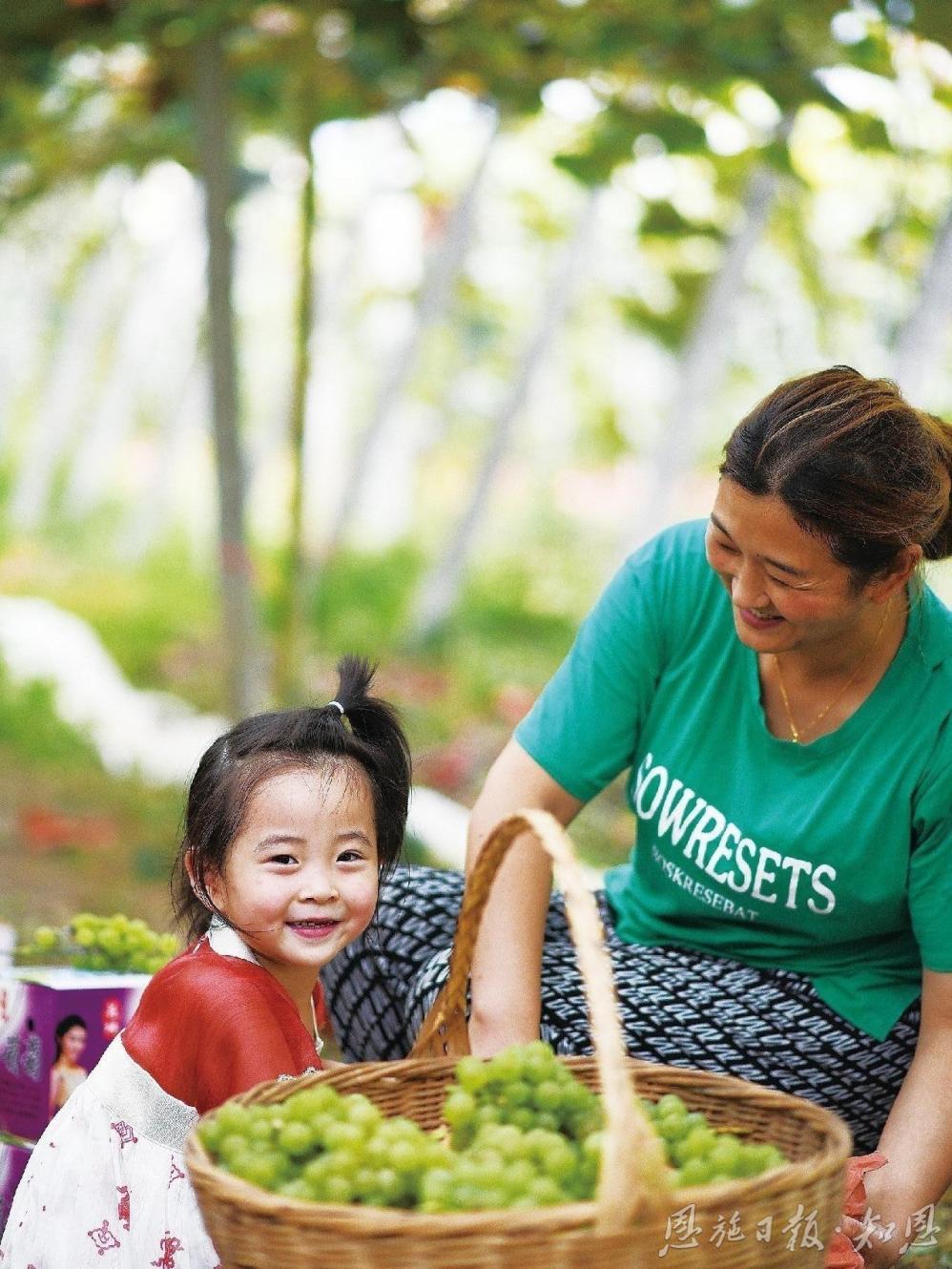 2021年9月11日,建始县花坪镇关口葡萄园里,采摘葡萄的母女俩笑脸盈盈。近日,国家知识产权局发布第625号公告,对“关口葡萄”等全国90个产品予以地理标志产品认定。(全媒体记者 沈祥辉 摄)