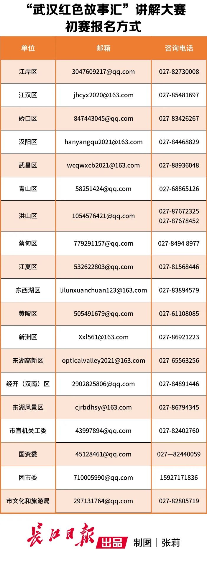 初赛阶段,通过线上征集、各区各单位组织选拔,将有100位红色故事讲述人进入复赛,讲演视频也将在长江日报“大武汉”客户端推出。决赛最终产生10位“武汉红色故事汇讲解大赛金牌讲解员”。