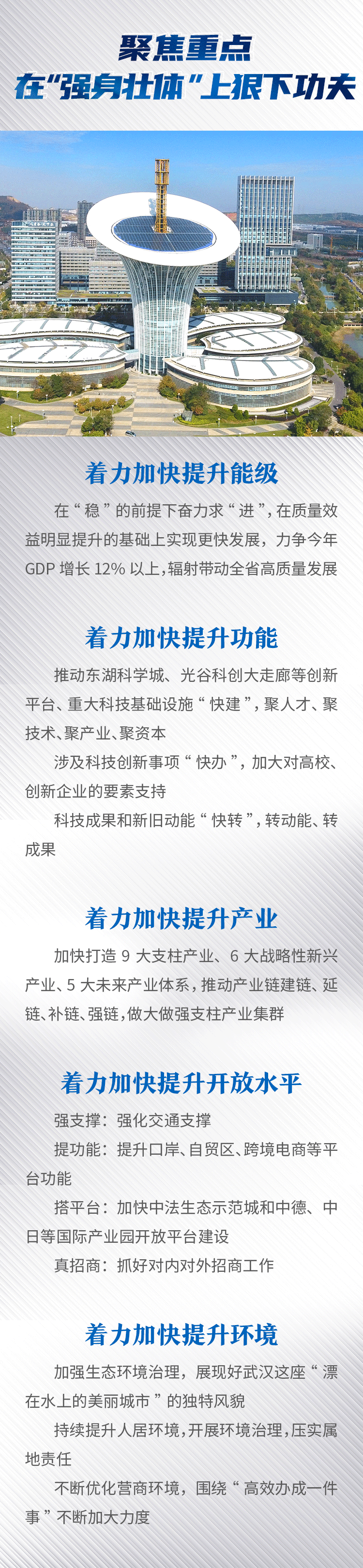 会议要求坚决扛起“一主引领”责任,在促进湖北“建成支点、走在前列、谱写新篇”、推动中部地区高质量发展中挑大梁、当先锋、打头阵。全市各部门切实聚焦重点,在“强身壮体”上狠下功夫。