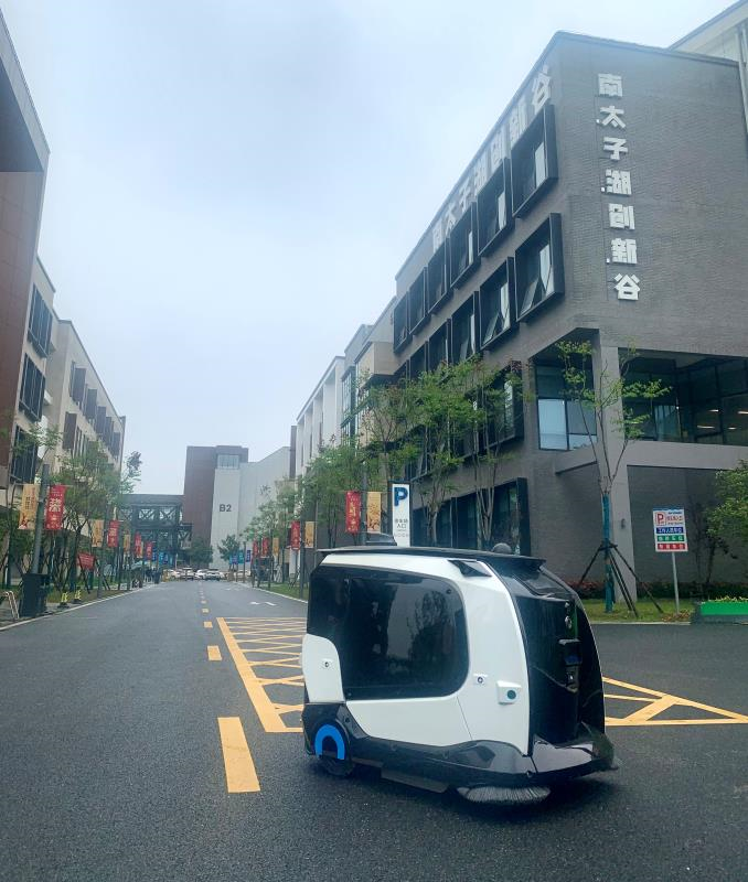 车谷融媒4月6日讯 阴雨绵绵,行人匆匆,一个白蓝相间的“大憨憨”在武汉经开区南太子湖创新谷园区内“悠然自得”地行进。