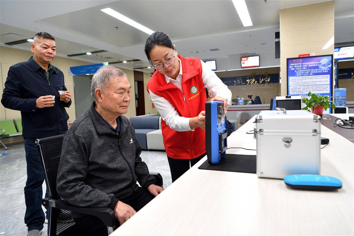 10月11日,在保康县市民之家公交服务窗口,工作人员为老年公交卡的市民进行刷脸认证。(视界网 杨韬 余夕雯 摄)