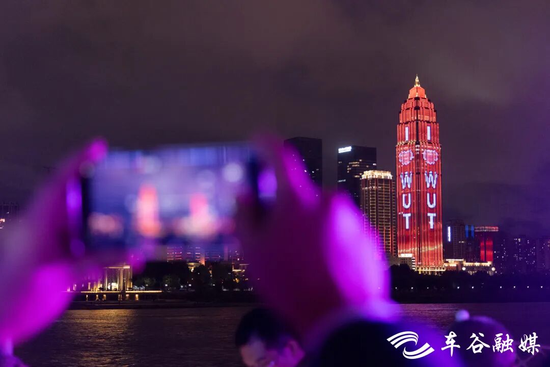汽笛鸣响,“古琴号”缓缓离岸、驶向江心。两江四岸,光影璀璨。长江大桥、黄鹤楼、绿地金融中心、长江二桥……长江两岸,幢幢标志性建筑渐次点亮。楼宇林立,桥梁飞架,在灯光的映射中流光溢彩,美轮美奂。“以武汉理工之名 赴中国车谷之约”等字样跃动其间,为江城梦幻夜景更添一抹亮色。
