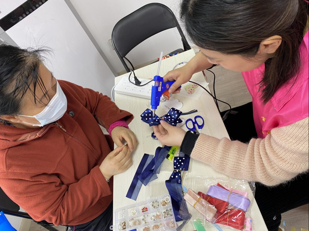大家不由自主地动起手来,在社工和志愿者老师的耐心指导下,按照步骤一步步跟着做,拿着原材料开始折、捏、粘、剪等。经过大家的努力,一些看似普通的丝带、夹子、珠花,魔术般变成了一个个精美的发夹。