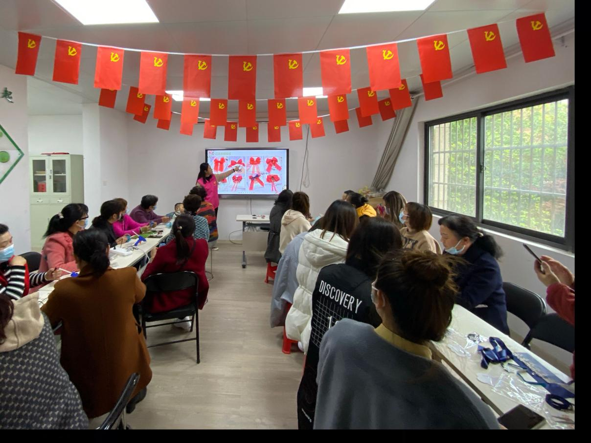 社区工作人员为大家发放了制作材料,并介绍了创意发卡和其制作工序,一袋袋装着色彩多样的丝带、珠花、夹子等发夹制作的材料和工具准备就绪之后,结合视频给大家详细讲解了发夹制作方法、技巧及注意事项。