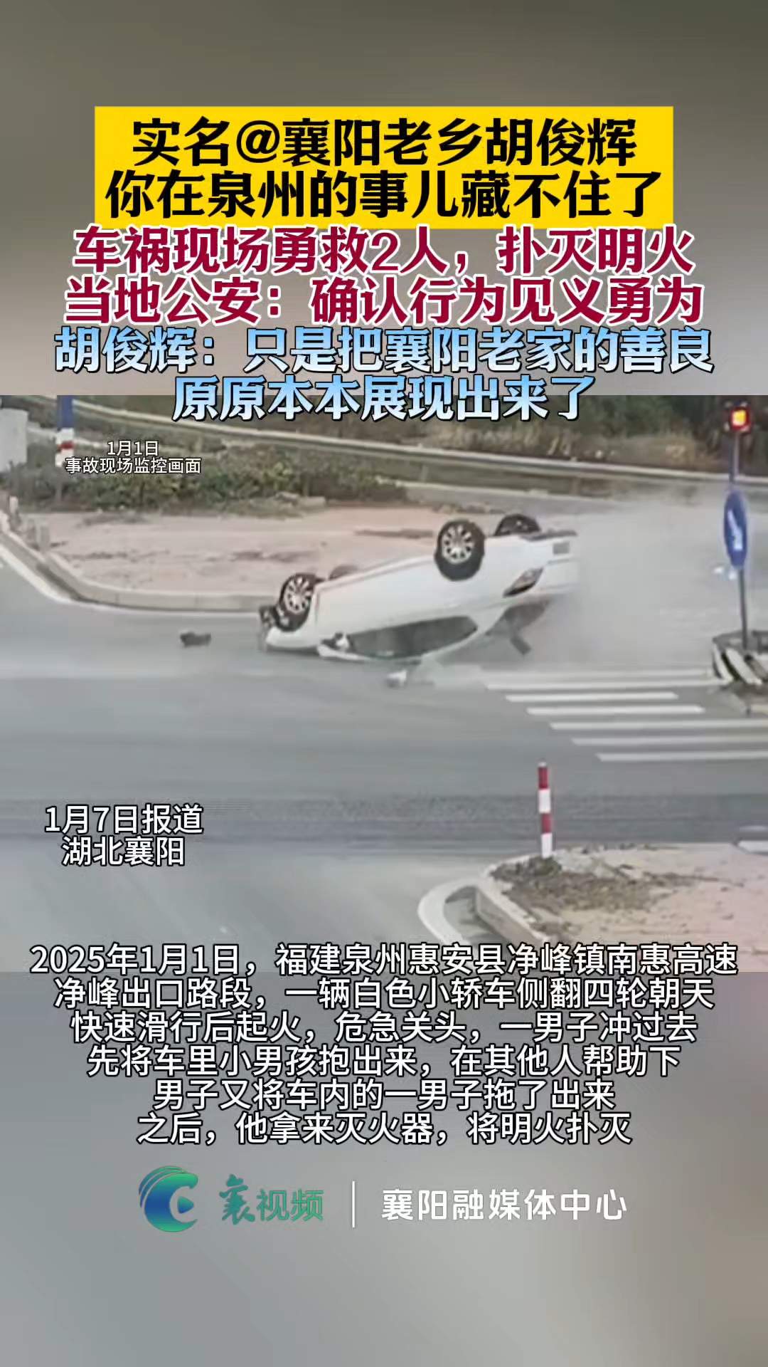1月1日,福建泉州,襄阳老乡胡俊辉驾驶土方车下班途中,目睹轿车侧翻起火。他猛打方向靠边停车,逆行冲向火海,徒手从破碎的后窗拉出哭喊的孩童,又奋力拖出被困的司机。烟熏火燎中,他取来灭火器扑救,直至险情解除,才默默驾车离开。