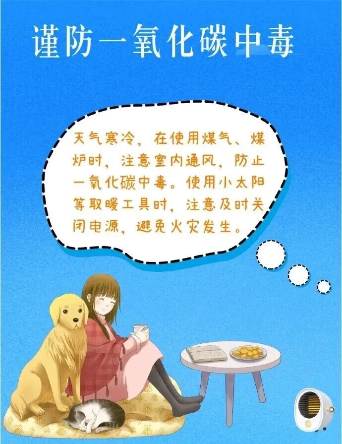 二是做好能源保供和公众健康防护,注意用电用气用火安全,谨防一氧化碳中毒;