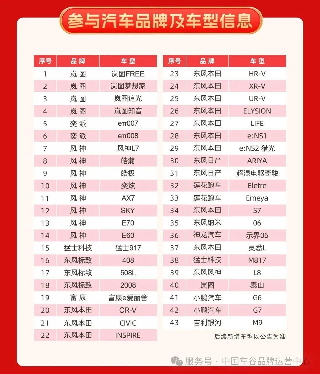 本次活动涵盖岚图、东风本田、奕派、风神、猛士科技、东风标致、路特斯、小鹏等主流品牌,并新增吉利银河M9等多款热门车型。(具体车型清单如下)