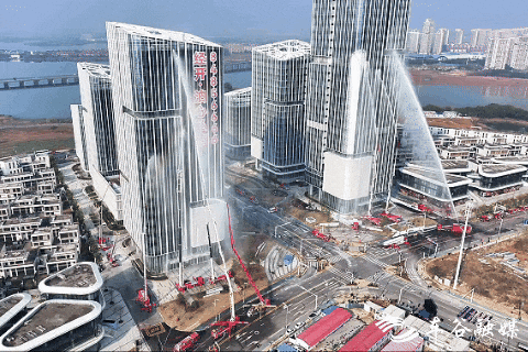 1月23日,湖北超高层建筑灭火救援综合实战演练在位于武汉经开区的经开·泊心私屿举行。