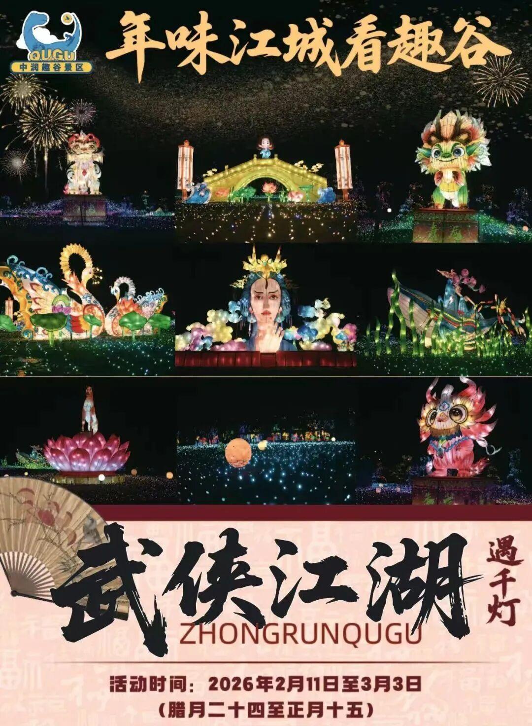 2月11日-3月3日,中润趣谷景区将举办“2026武汉趣谷仙侠小镇-百戏千灯游园会”系列活动。来趣谷景区,市民不仅可以参与看花灯、看杂技、看马戏,还可以穿越西游记、亲身参与“六大门派围攻光明顶”,畅玩仙侠、武侠世界,与白娘子、济公、郭靖、张无忌互动。