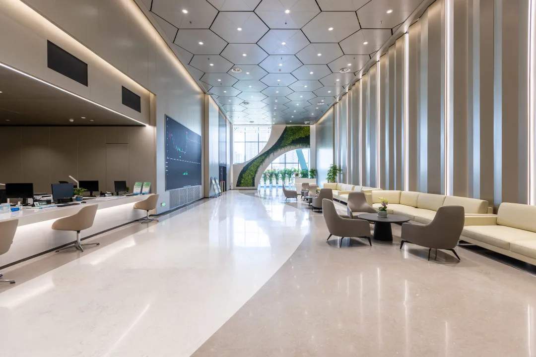 中碳登登记结算大厅,六边形的“碳”元素装饰抬头可见。