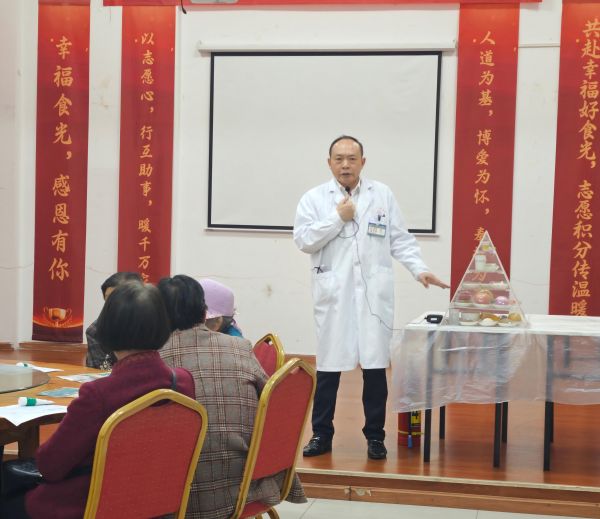 紧接着,武汉九康医院胡院长进行老年健康专题宣讲。胡院长重点讲解了老人食用青团的注意事项,明确无糖青团并非完全无糖,其糯米基材与内馅本身含有的糖分,提醒糖尿病、肠胃功能较弱的老年人需适量食用,同时叮嘱未成年人食用时需有成人看护,防范噎食风险。随后,胡院长结合三角形膳食宝塔,详细介绍日常饮食搭配要点,从谷薯类、蔬菜水果类、肉蛋奶类及油盐摄入等方面,讲解老年人低糖、清淡、易消化的饮食原则,引导居民树立科学的饮食养生观念,守护自身健康。