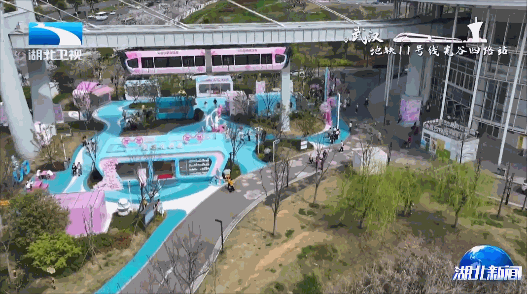 出了地铁口,不远处就是樱花市集,不仅能拍美照、买周边,还能直接坐上空轨,俯瞰沿途10.5公里的美景。来自广东的冯女士第一次坐空轨,被脚下的透明玻璃惊喜到了:“脚下有风景,窗边也有风景!太神奇了!”