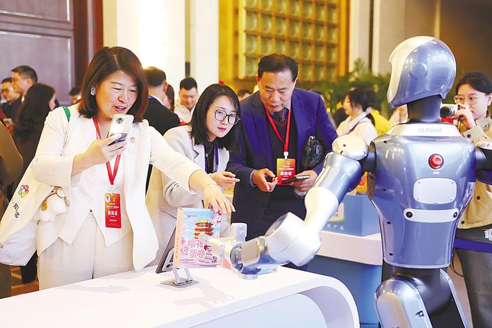 科技赋能荆楚好物,嘉宾体验机器人零售樱花蛋卷。(湖北日报全媒记者 陈少哲 摄)
