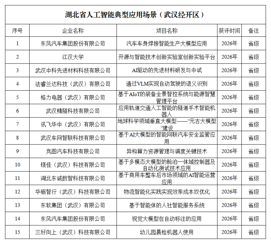 车谷融媒4月26日讯 近日,在2026湖北人工智能产业发展生态大会上,2026年湖北省第一批人工智能典型应用场景完整名单发布,武汉经开区15项成果入选,居全市前列。