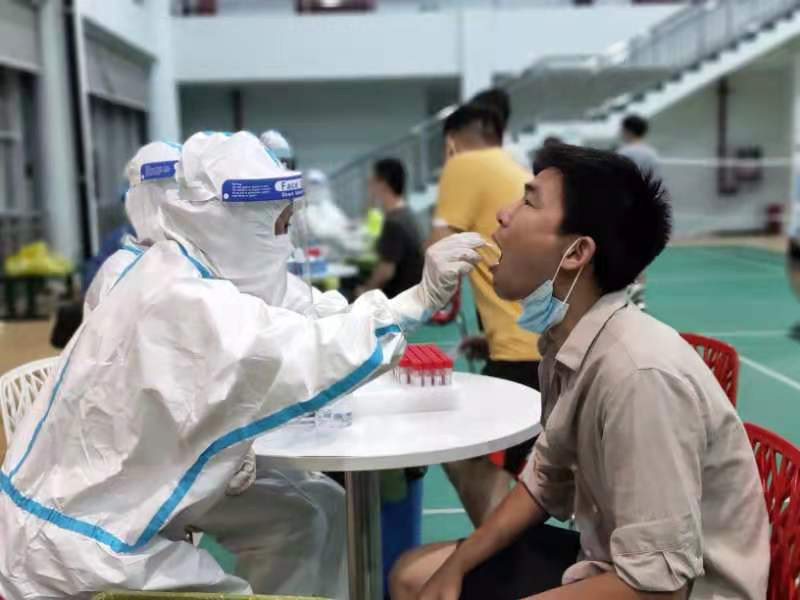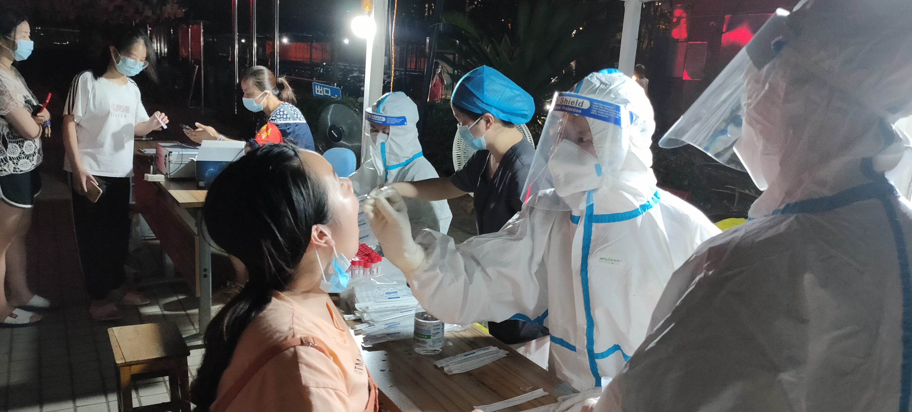 8月3日,武汉经开区连夜部署并开展全员核酸检测,军山街卫生院医护人员迅速组建成十余个采样小分队,在街防疫指挥部的指挥下依序分布到各个点位。尽管酷暑难耐,防护服湿了一套又一套,大家一直坚持工作到晚上11时。
