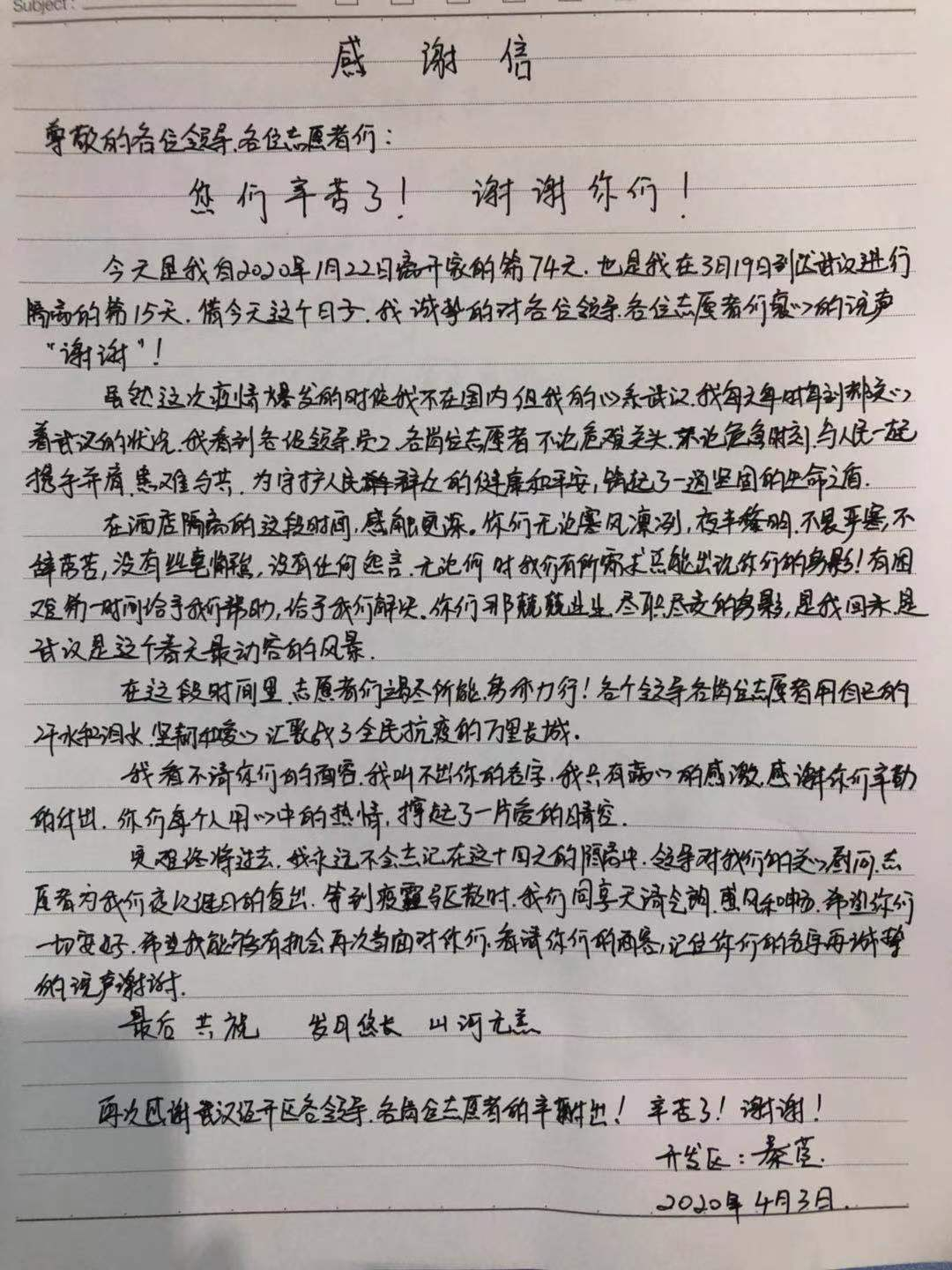 类似的小事还有很多,正是像程洪庆这样把贴心服务做到群众心里去,区疫情防控外事组收到了20多封隔离人员写的感谢信,诠释了何为“一切为了人民、一切依靠人民”。