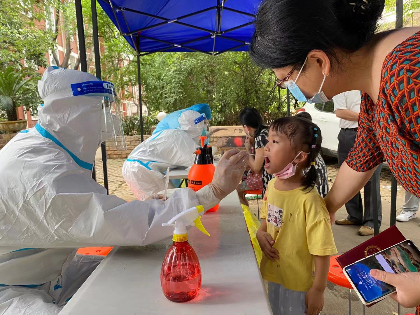 采样现场,医护人员严格执行采样流程,穿戴好防护装备,为每一位居民进行核酸检测采样。受检者10人一组,均佩戴口罩、手部消毒、体温测量后,依次进入信息录入区,扫描工作人员手中的二维码,自行填入编号(由医务人员统一提供)、姓名、性别、身份证号码、联系电话等信息。随后,受检者保持一米距离排队,依次进入采样区接受核酸咽拭子采样,整个过程有条不紊。