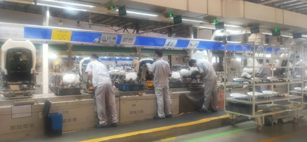 走进东风安道拓公司车间,现场一派繁忙的生产景象,工人们身穿工作服,佩戴口罩等防护用具,有条不紊地作业着,一件件汽车座椅缓缓驶下生产线,打包等待交付。