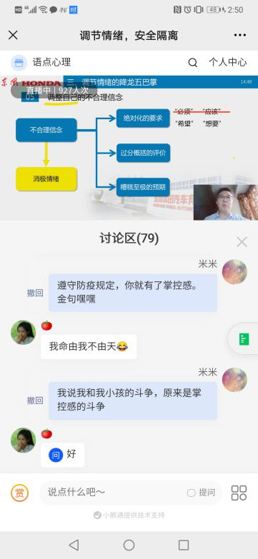 因配合防疫政策,东风本田汽车有限公司600多名员工在工厂宿舍隔离,其他员工居家隔离。针对以上情形,国家二级咨询师、武汉大学发展与教育研究所项目组成员许弼博士受邀在心理微课上,围绕情绪的产生由来、消极情绪的危害以及调节情绪的“降龙五掌”三个方面,深入剖析了隔离期间常见的心理问题以及应对措施,帮助1046人次青年“解心结”。