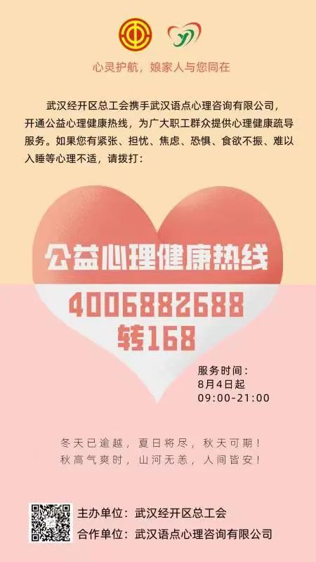 自8月4日起,每天9:00-21:00,如果大家有紧张、担忧、焦虑、恐惧、食欲不振、难以入睡等心理不适的情况,均可拨打4006882688转168,将有专业的心理老师在线提供心理疏导服务。