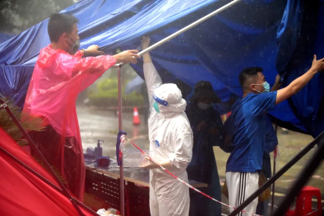 雨很大,防护面罩打湿了有些起雾,金铭保持一伸一收的动作默不作声。大约2-3分钟帐篷重新搭好,她又继续忙碌起来。“后来雨实在太大,居民也回家避雨,工作暂停了半小时。” 截至9日下午6点,这支50人的核酸小分队共采样5972余人份,完成了当日计划。