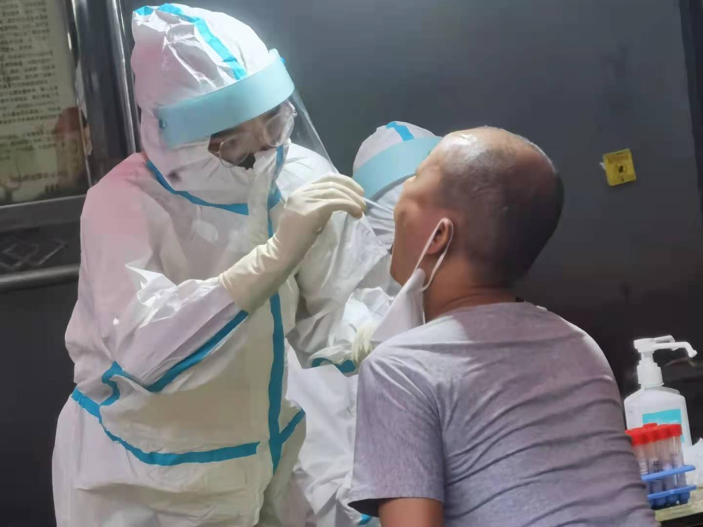 8月6日,户外近40度的高温,郭徐岭社区网格员张玉维和李文兵,在贸易二路小区内穿着厚厚的防护服,一边维护着核酸检测现场秩序,一边手拿喇叭通知居民有序出来做核酸检测,直至晚上21时,全小区300余人核酸检测全部做完。“打好此次疫情防控战,就是要和时间赛跑,容不得半点马虎和懈怠!” 张玉维、李文兵始终牢记郭徐岭社区蔡书记的嘱托,按照当天全部做完的上级要求,还亲自带人员上门,为小区内行动不便的老人进行核酸检测,确保不漏一人。