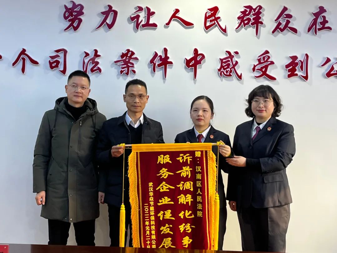 当天上午,武汉华焱新能源节能环保科技有限公司总经理刘维收到汉南区人民法院送达的“无讼和解卡”后,当即为该院送上锦旗,为办案法官实施的“零成本”诉前调解点赞。