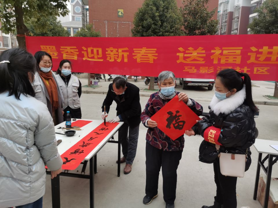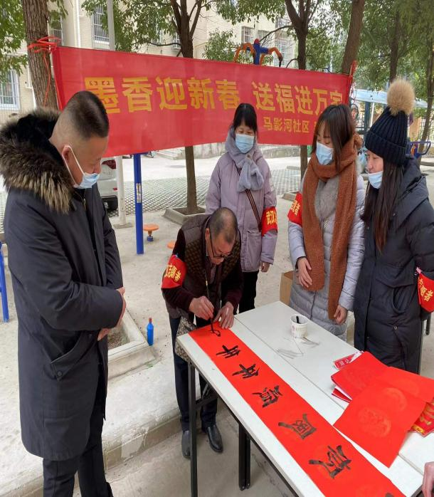 今年的送祝福活动中,马影河社区分别在康居家园和坛山花园两个还建小区同时开展“笔墨书写邻里情 春联送福暖人心”活动,把祝福送到居民手中。