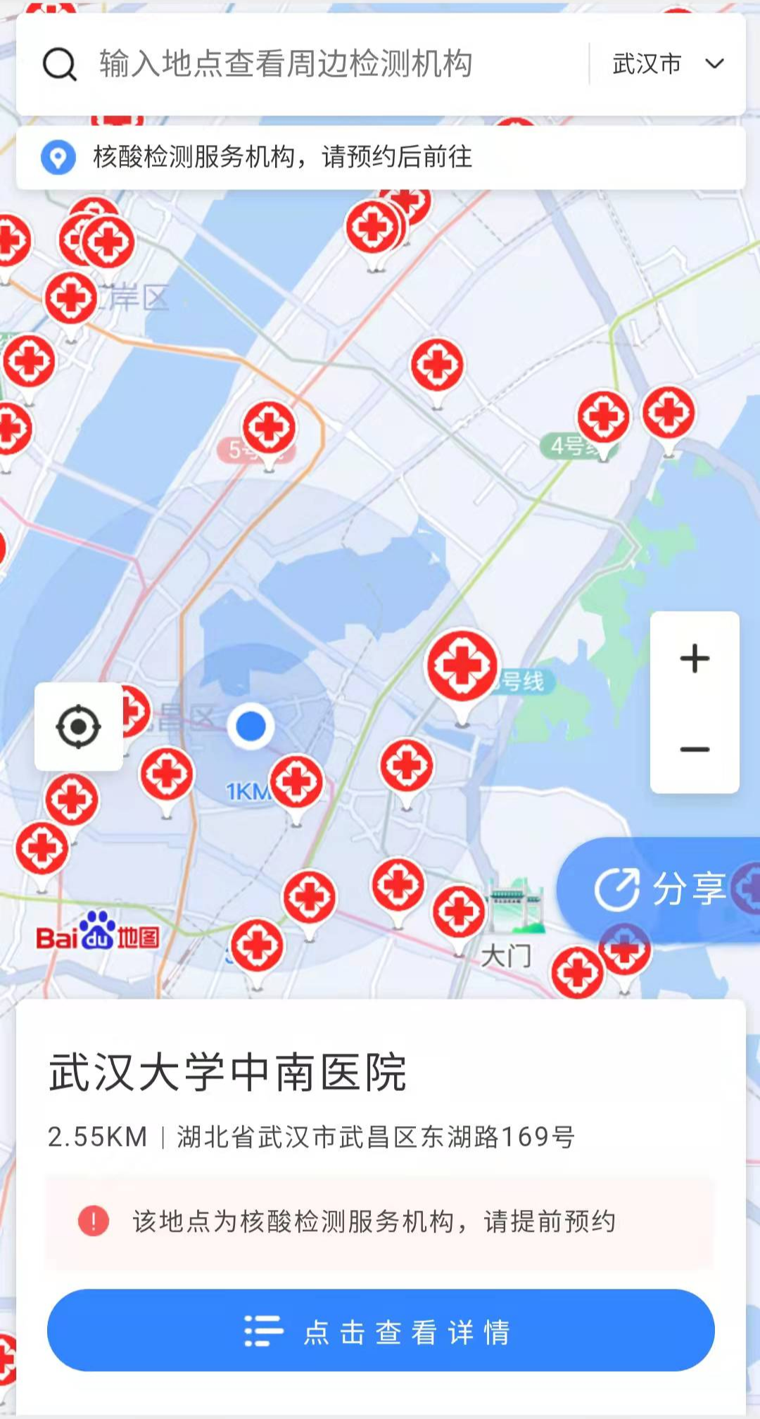 点击“核酸查询地图”进入地图页面即可查询到离你最近的