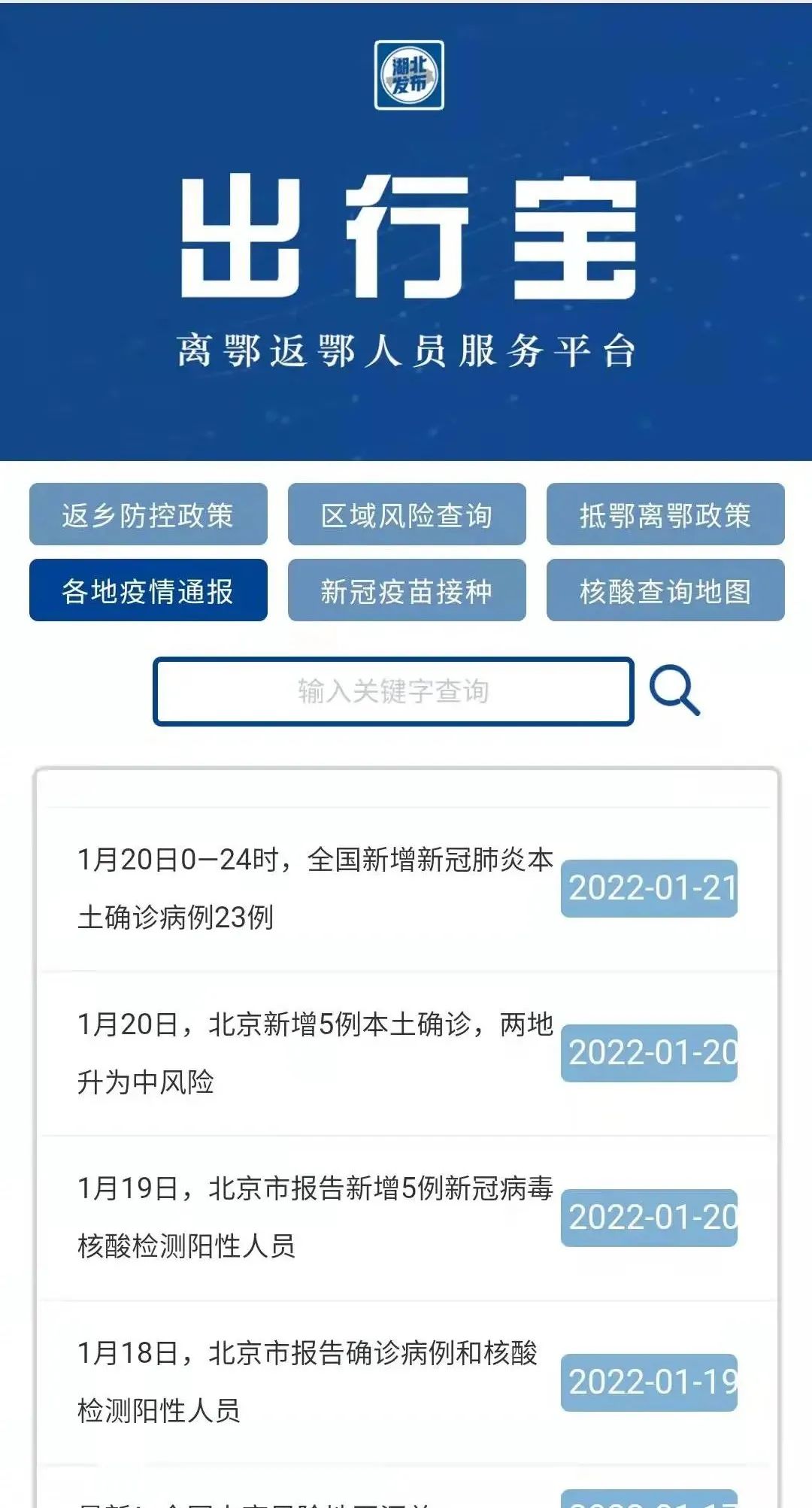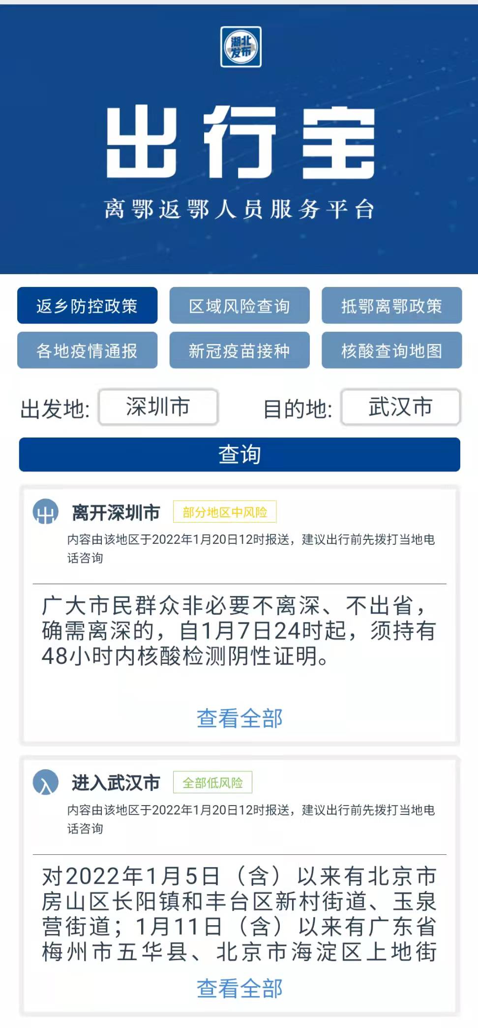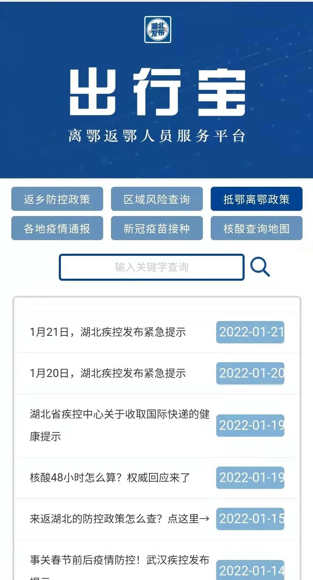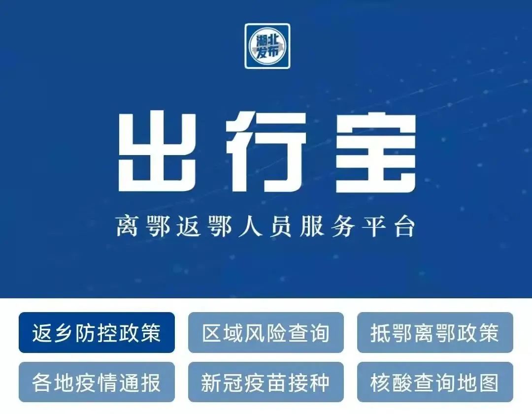 临近春节,针对网友们关心的离鄂返鄂疫情防控最新政策等热点内容,小布再次升级网站服务功能,正式推出“出行宝 离鄂返鄂人员服务平台”返乡防控政策、区域风险查询抵鄂离鄂政策、各地疫情通报新冠疫苗接种、核酸查询地图。