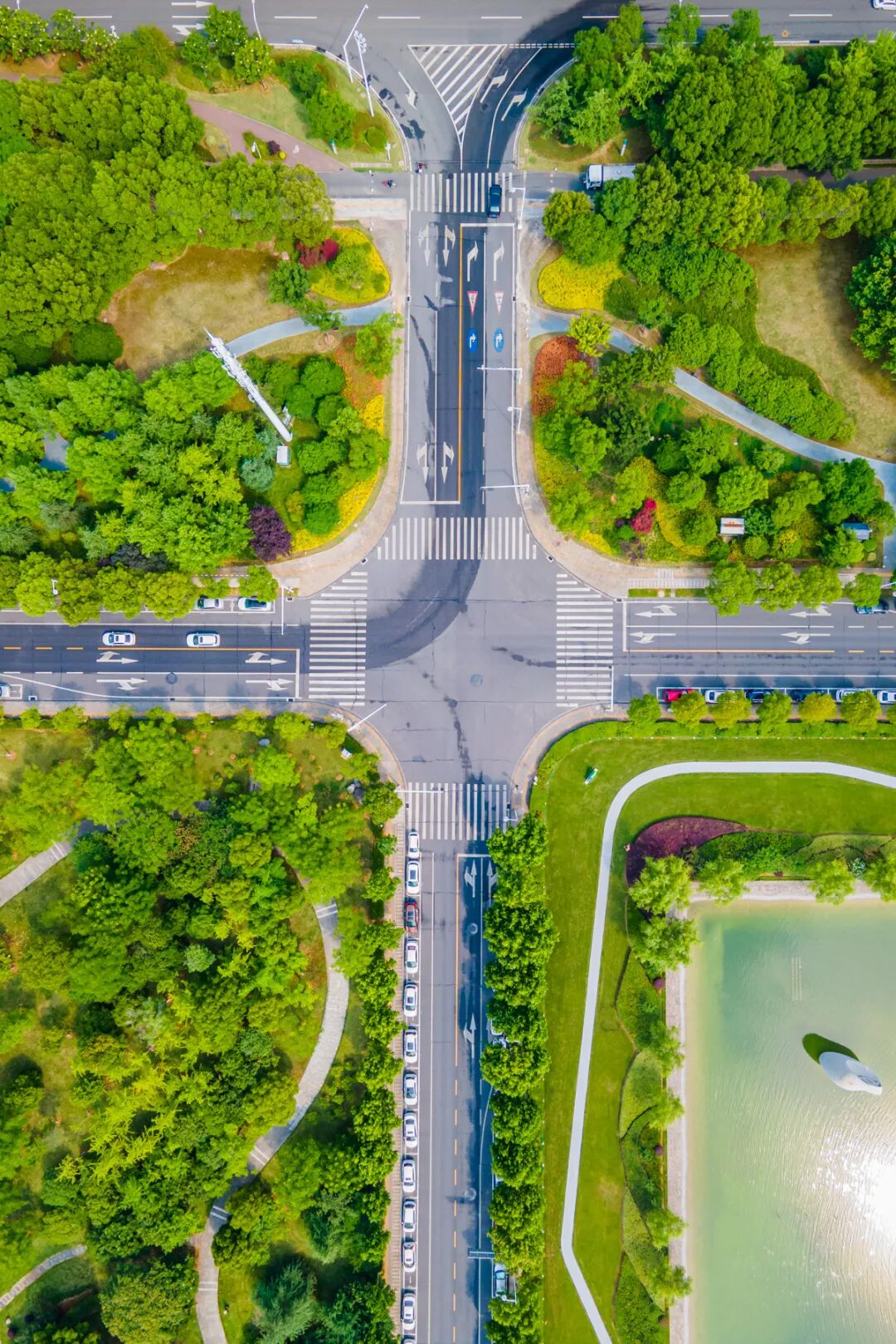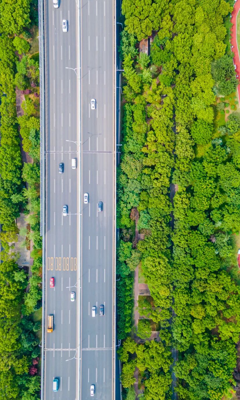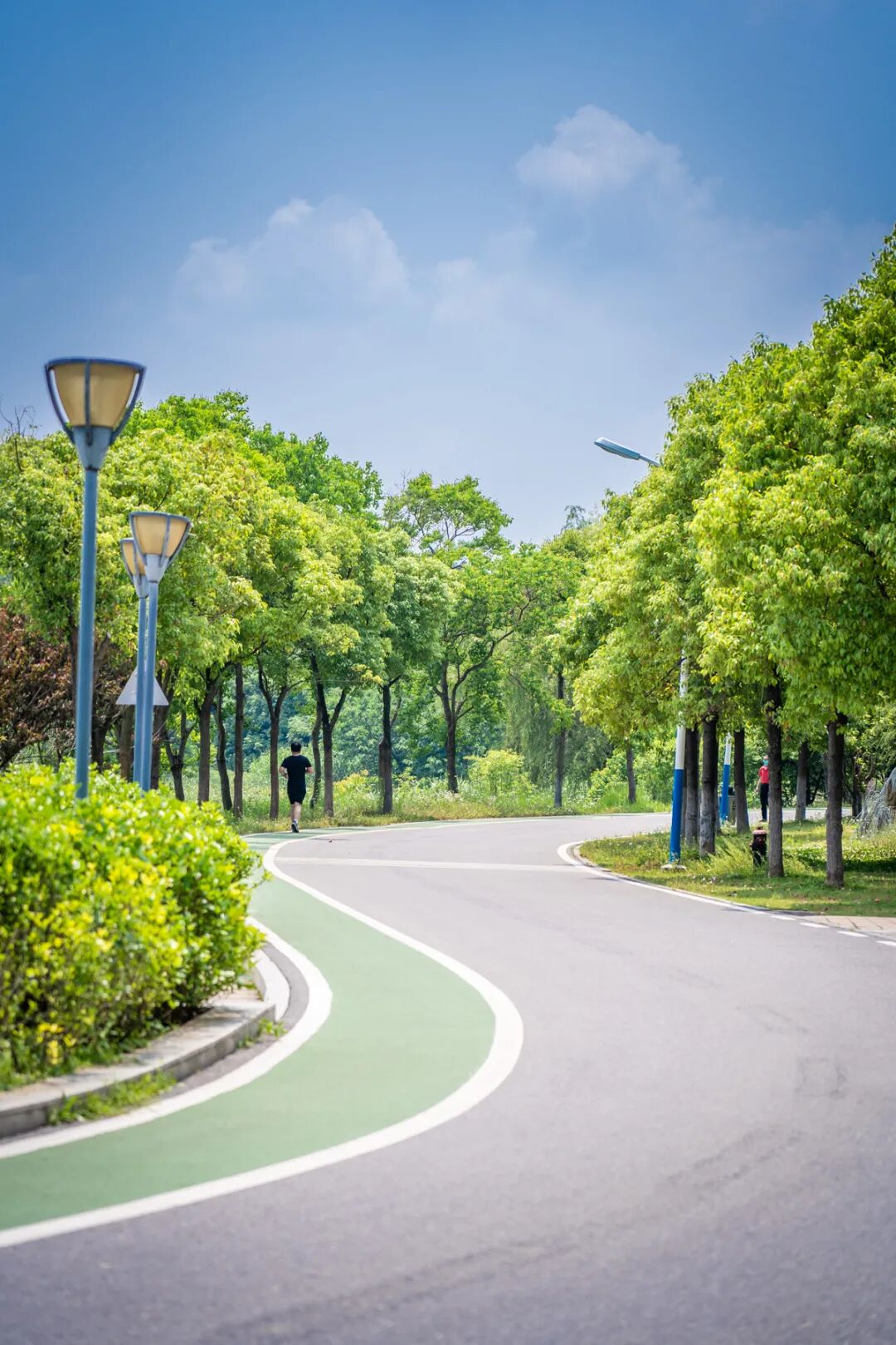 道路两旁,绿意弥漫干净整洁,有种秩序的美感。