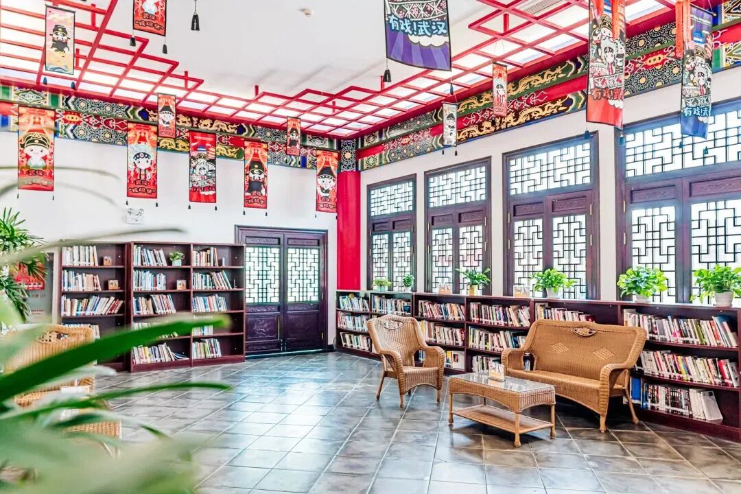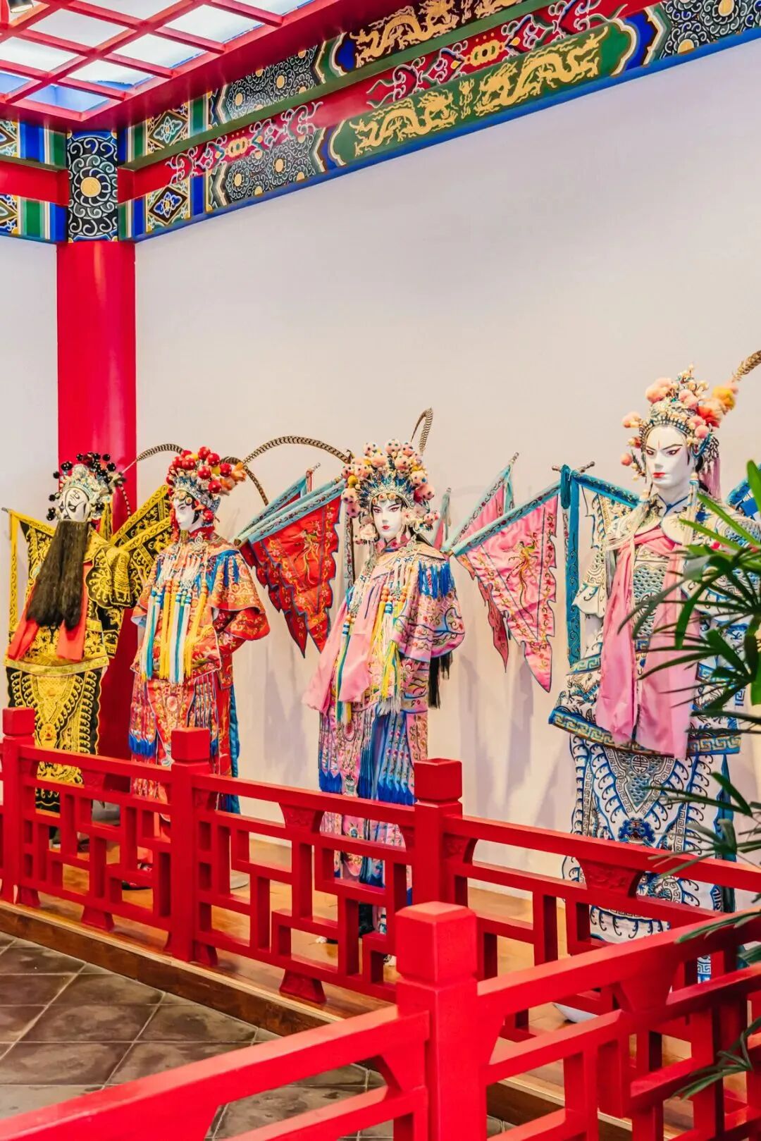 大型木雕“弥勒佛”笑脸迎客,生旦净末丑的巨大脸谱跃然墙上,走廊上一字排开十八般兵器,戏院的每一处都蕴含着浓厚的中国传统文化特色。