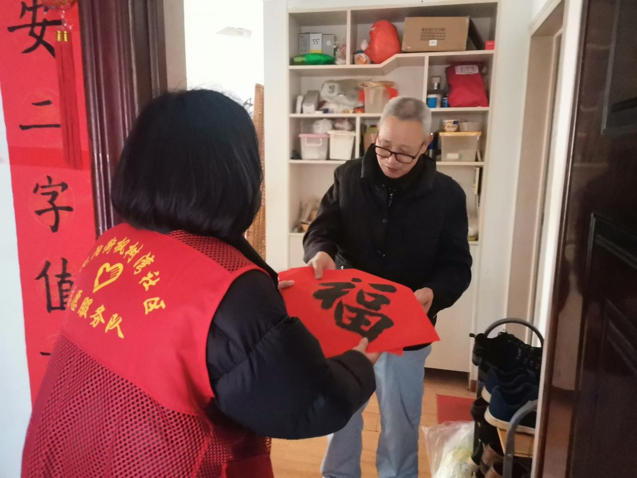 活动当天,社区志愿者还将写好的春联、“福”字送到百岁老人、困难群众家中,送去节日的祝福。