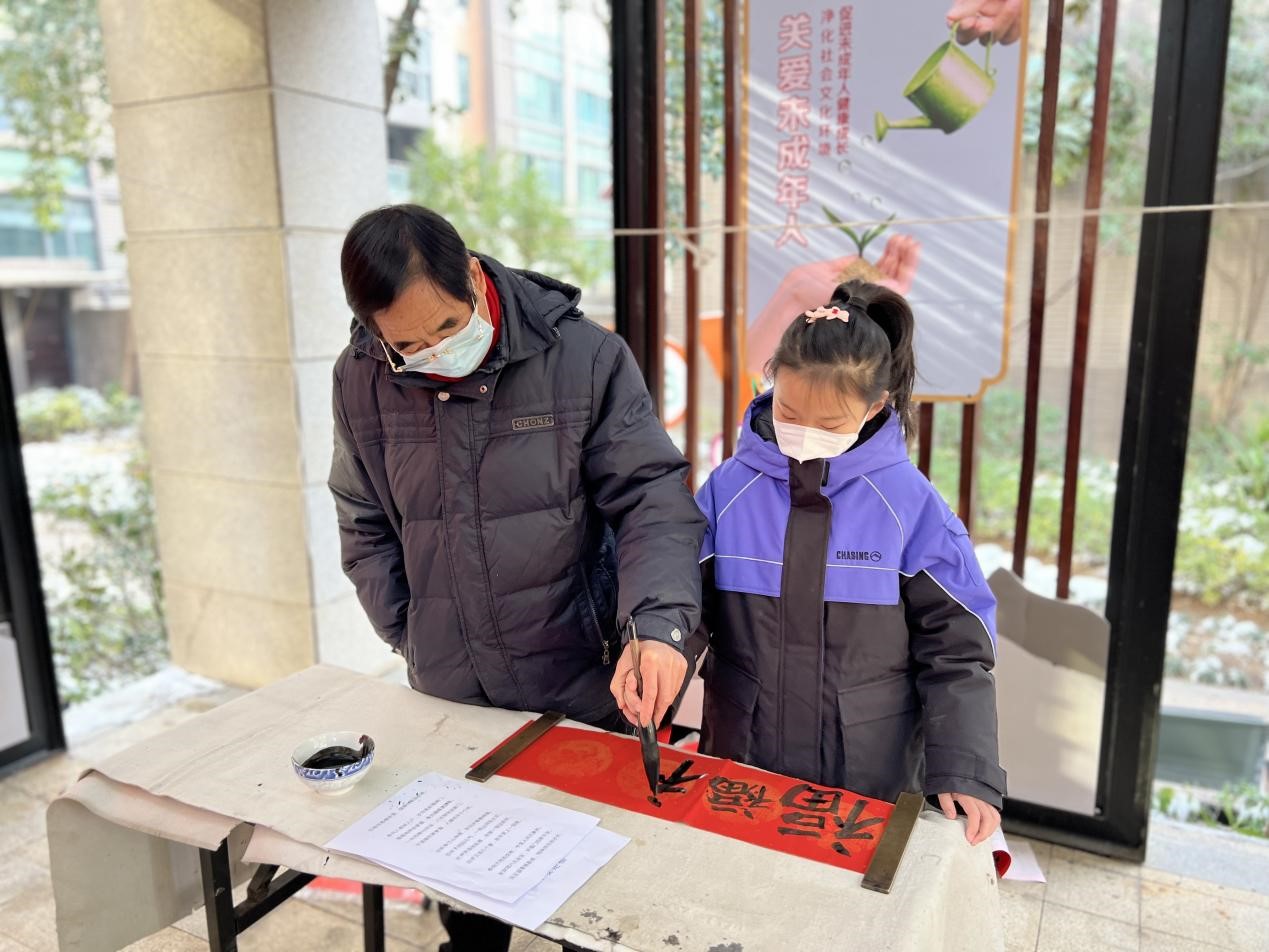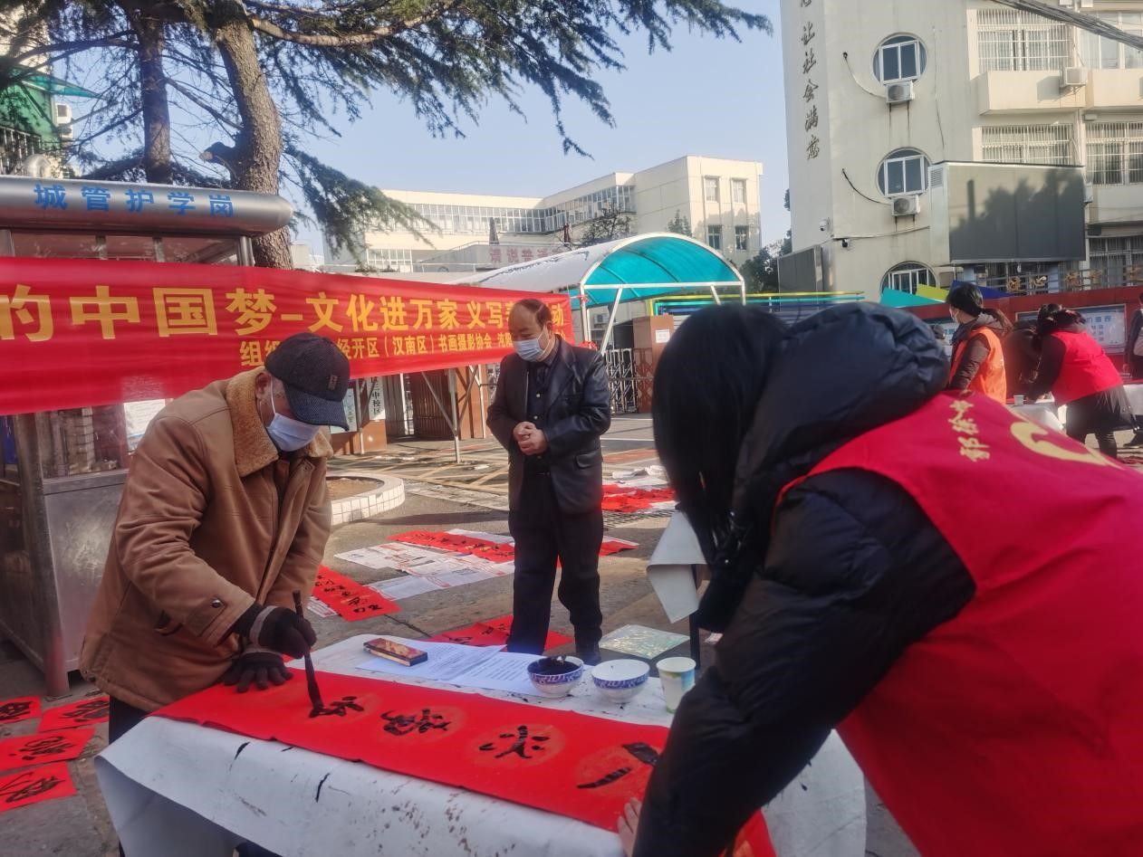 车谷融媒1月17日讯 1月16日上午,由沌阳街道党工委、办事处主办,沌阳街道文体事业服务中心、武汉经开区书画摄影协会联合官士墩社区、郭徐岭社区在海伦春天小区、郭徐岭小区举办“我们的中国梦--文化进万家”义写春联、送祝福活动,将浓浓的年味儿送到老百姓的家门口。