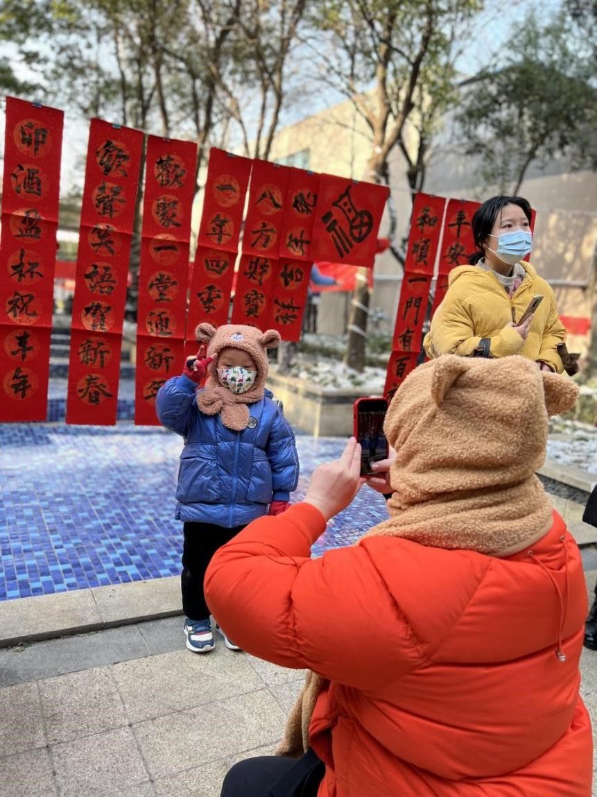 活动现场,12名书画家们热情高涨,满怀热情地挥毫泼墨、笔走龙蛇,将美好祝福化作一幅幅饱含深情的春联。居民朋友们有的围在书画家身旁,看着漂亮的毛笔字,念念有词,纷纷赞叹;有的拿起手机,以春联为背景为家人拍下带着“年味”的照片;还有小朋友跃跃欲试,在老书法家的指导下写下喜庆的“福”字。红红的春联、浓浓的墨香,描绘出新时代的精神风貌,表达对党的二十大与美好生活的讴歌礼赞,也寄托着人们对即将到来的兔年春节的憧憬与向往。