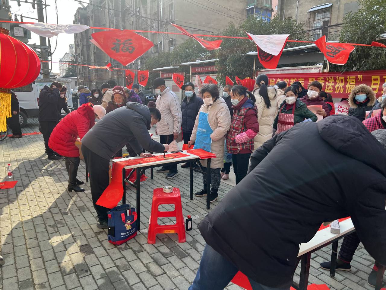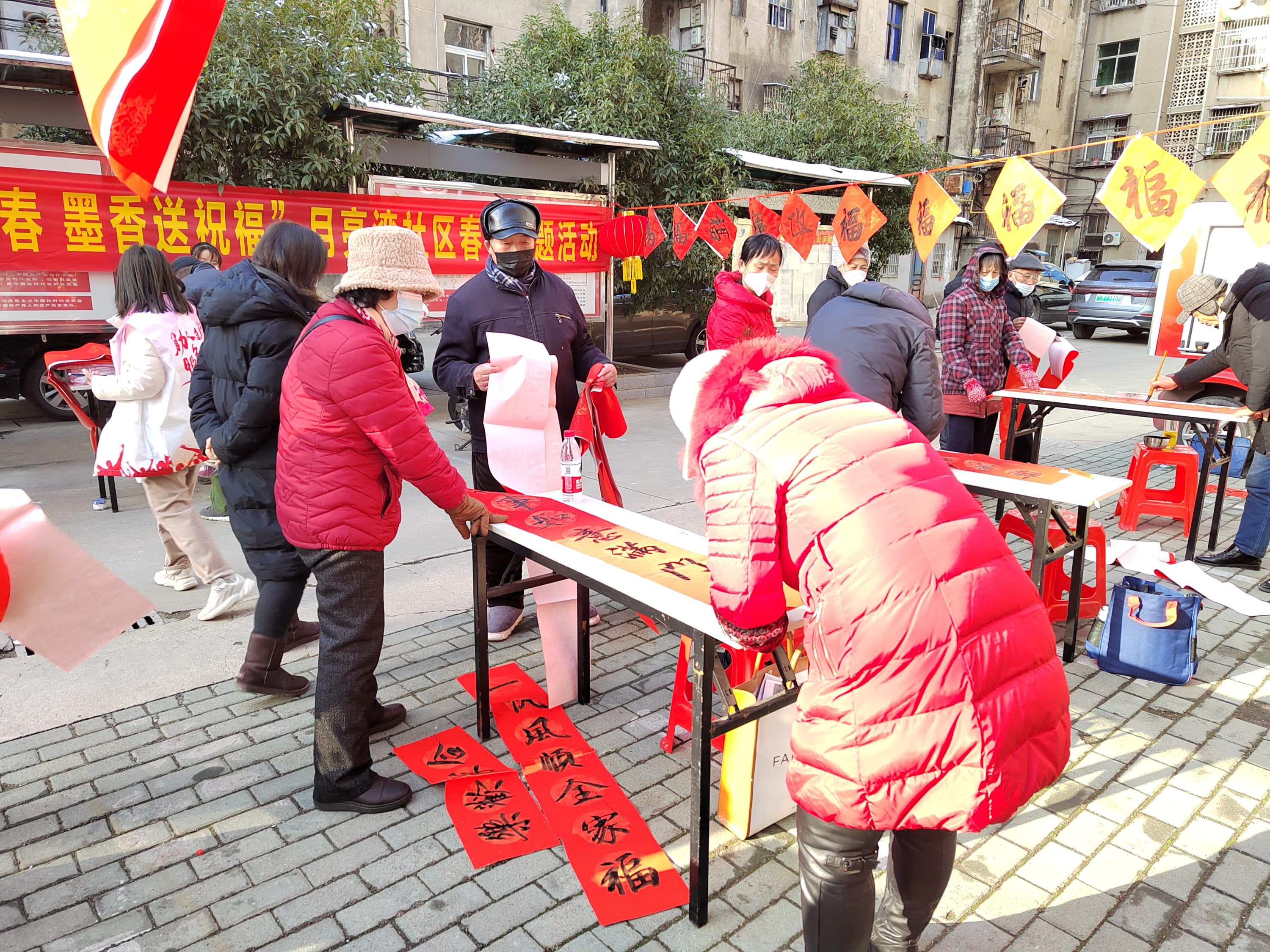 活动现场,书法爱好者们铺纸研墨,为居民送上祝福满满的春联和“福”字。