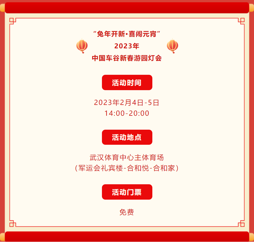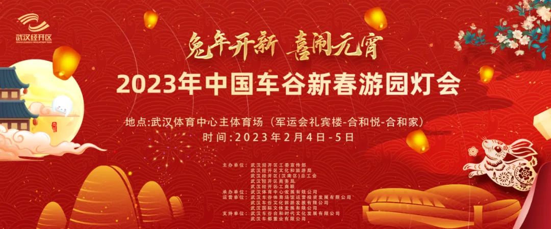 2月4日-5日,武汉经开区将在武汉体育中心主体育场区域,举办首届中国车谷新春游园灯会。届时,市民朋友可免费体验舞龙舞狮、赏花灯、猜灯谜、汉服游园等各类丰富多彩的活动。