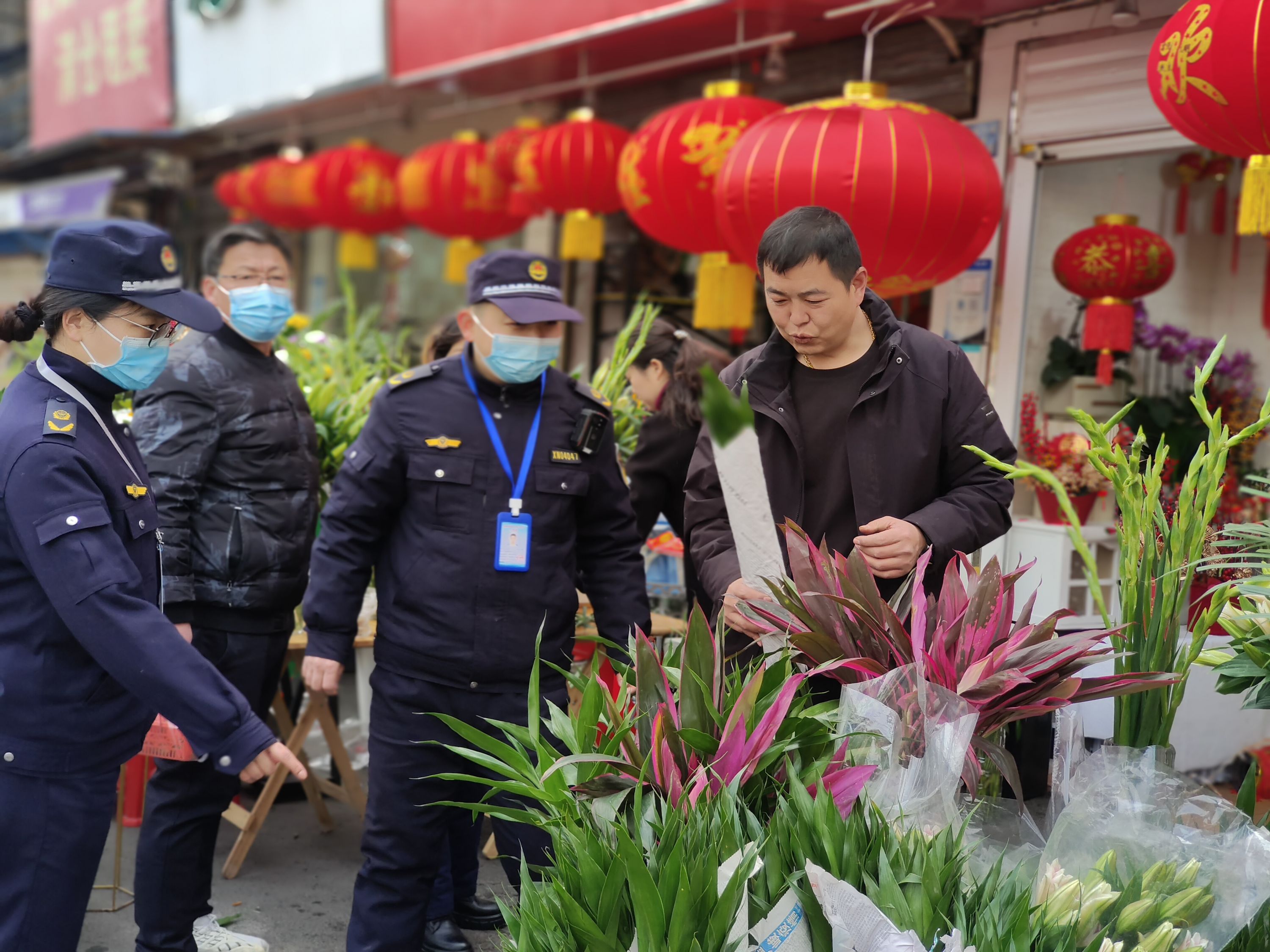 “老板,新年好!今天买花的人还蛮多,祝您生意兴隆、财源滚滚!虽然我们今年春节期间的管理政策暂时放宽松了一点,可以把商品摆放在门外一部分,但是‘门前三包’的职责仍要履行起来,垃圾及时收到一起,注意环境卫生。”1月25日,纱帽街道综合执法中心执法人员邓笑热情地跟礼品店老板沟通。