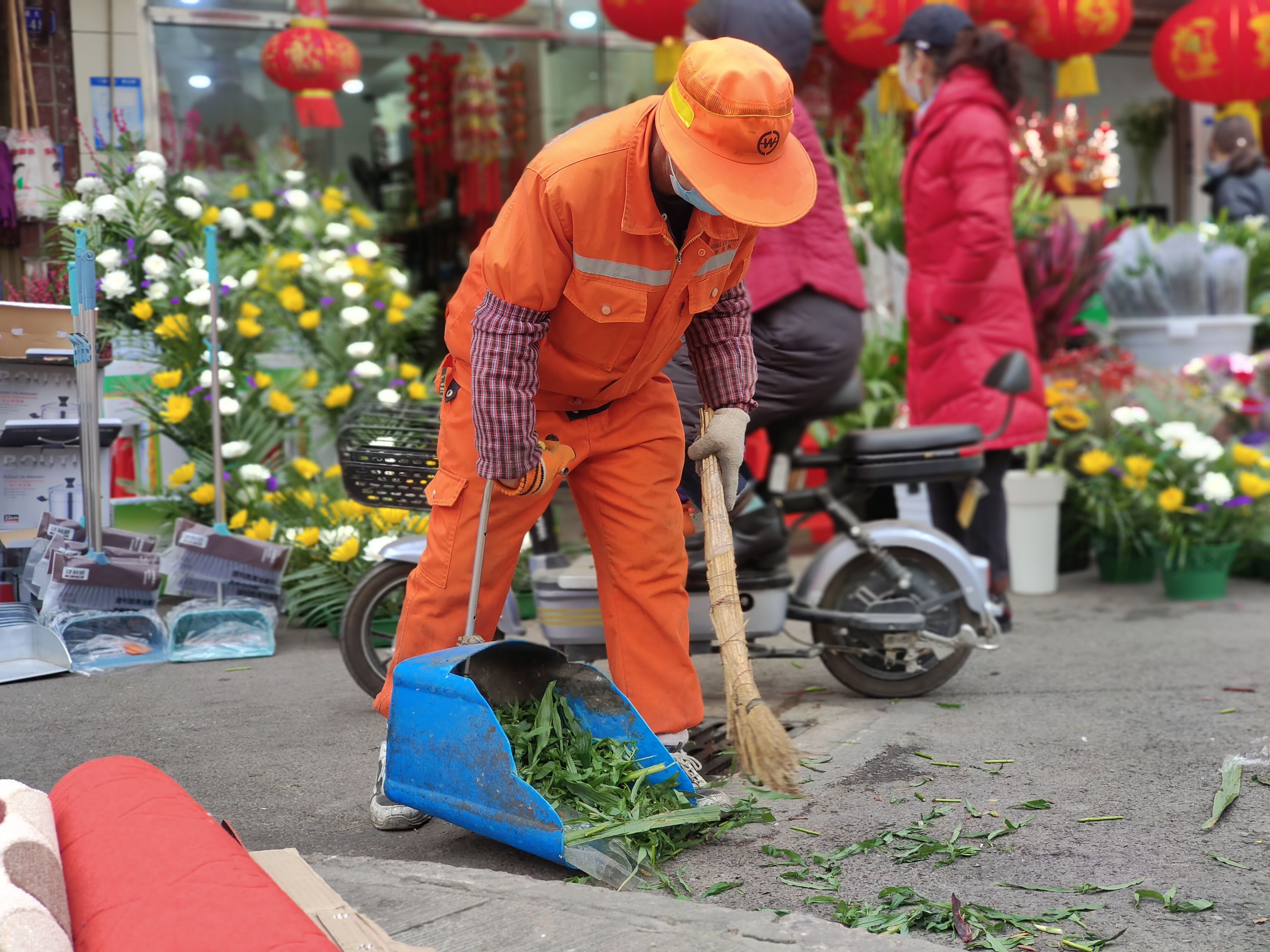 周明中性格内敛,他一边熟练地将花店门前地面的鲜花残叶归堆、装进撮箕,一边介绍,他干环卫工作已经有12个年头,过年不休假已经成为常态,反正自己是本地人,每天都可以与家人团聚。这时,周明中又将撮箕里的垃圾倒进大垃圾桶,转运到集中存放点,这么多年也习惯了,脏活累活总得有人来做,看到城市干净整洁,万家灯火,心里也美滋滋的。