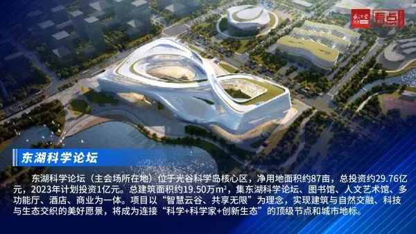 其中,东湖科学论坛项目位于光谷科学岛核心区,净用地面积约87亩,总投约29.76亿元,2023年计划投资1亿元。项目以“智慧云谷、共享无限”为理念, 实现建筑与自然交融、科技与生态交织的美好愿景,它将成为武汉光谷的新地标。