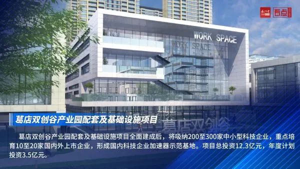 葛店双创谷产业园配套及基础设施项目全面建成后,将吸纳200至300家中小型科技企业,重点培育10至20家国内外上市企业,形成国内科技企业加速器示范基地。项目总投资12.3亿元,年度计划投资3.5亿元。
