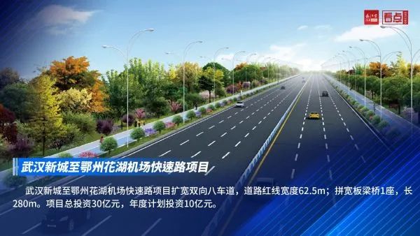 备受关注的武汉新城至鄂州花湖机场快速路项目正式启动,扩宽双向八车道,道路红线宽度62.5m;拼宽板梁桥1座,长280m。项目总投资30亿元,年度计划投资10亿元。建成后将为武汉新城人才、产业等流通打通空中通道。