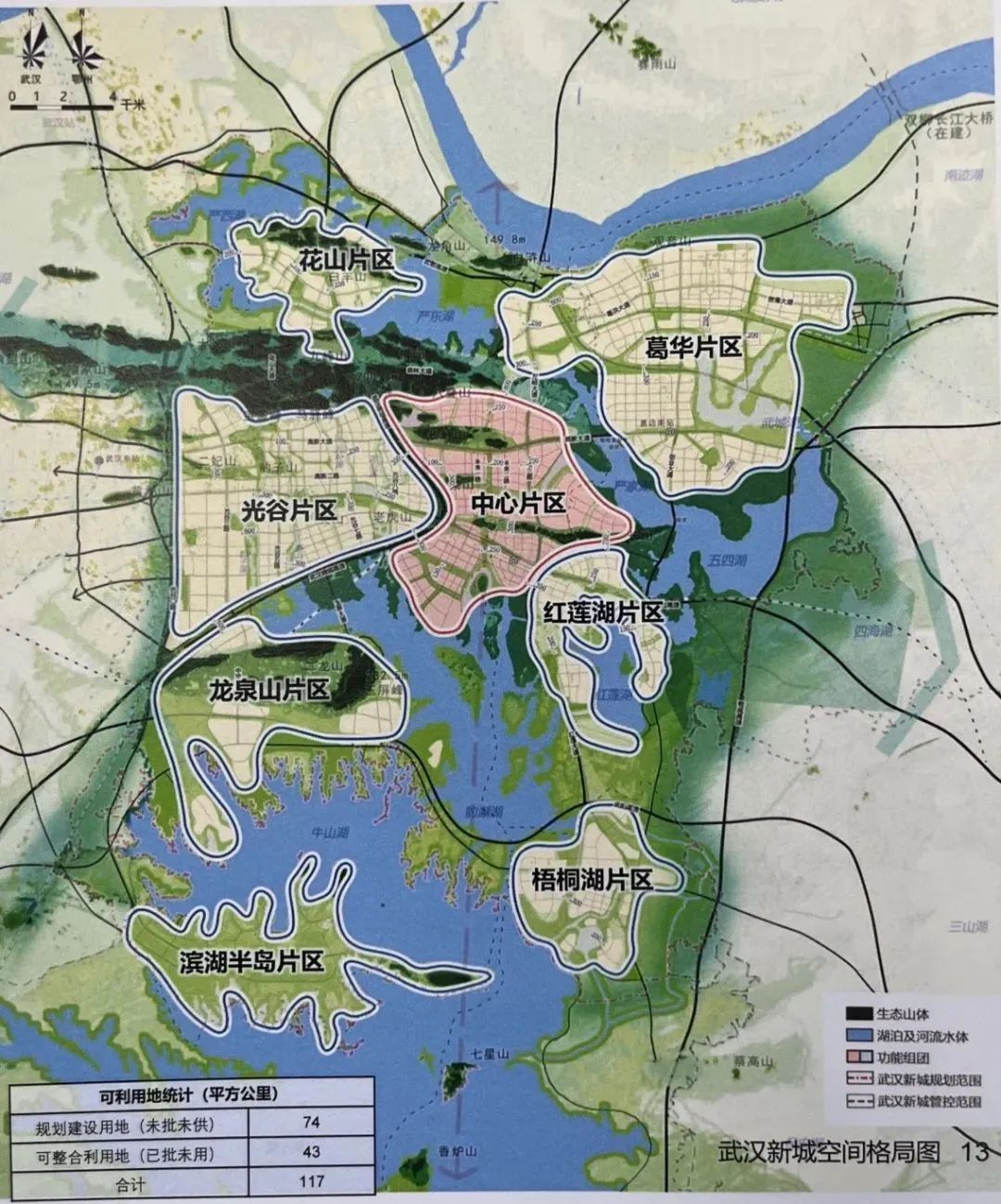 大纲明确,规划多中心组团式城镇用地布局,沿江环湖构建武汉新城组团、武昌组团、汉口组团、汉阳组团、汤逊湖组团、鄂州主城组团、黄冈主城组团、黄石—大冶组团(含黄石新港)八大城市组团。其中,武汉新城组团位列第一,也最受社会各界关注。