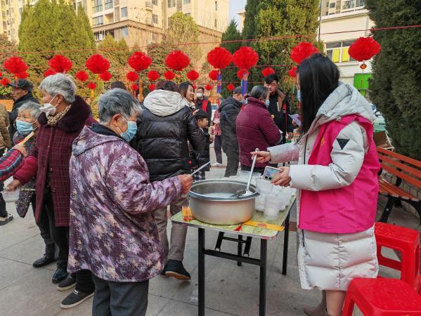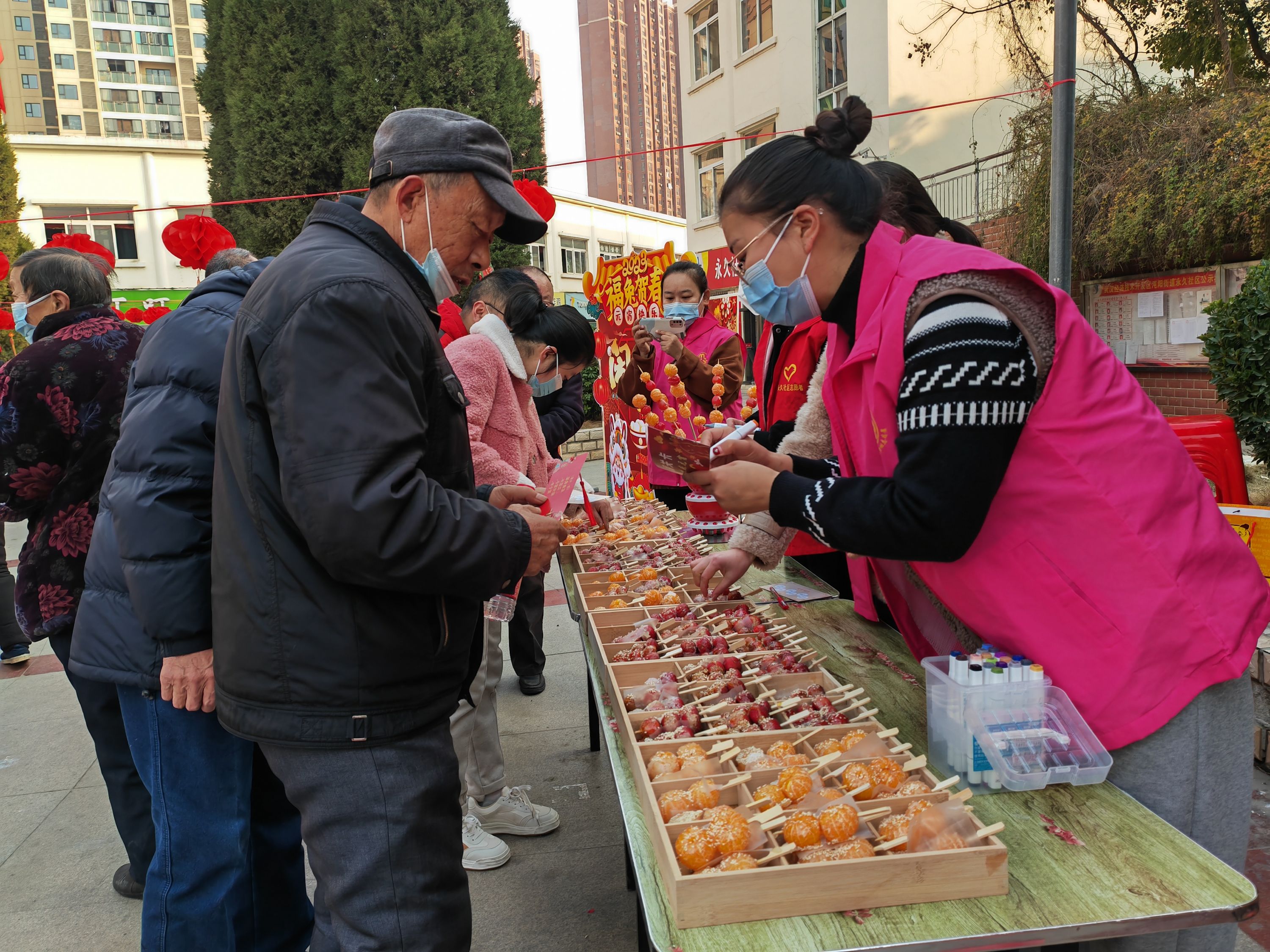 “这边有糖葫芦,您喜欢吃什么口味的呀?这里有砂糖橘的、山楂的。”志愿者一边介绍,一边把糖葫芦送到他们手上。“吃汤圆啦!”志愿者们将一盆盆热滚滚的芝麻汤圆端出来,大家有序排队,迫不及待地品尝汤圆。