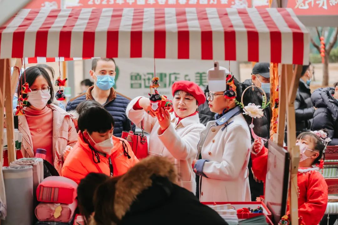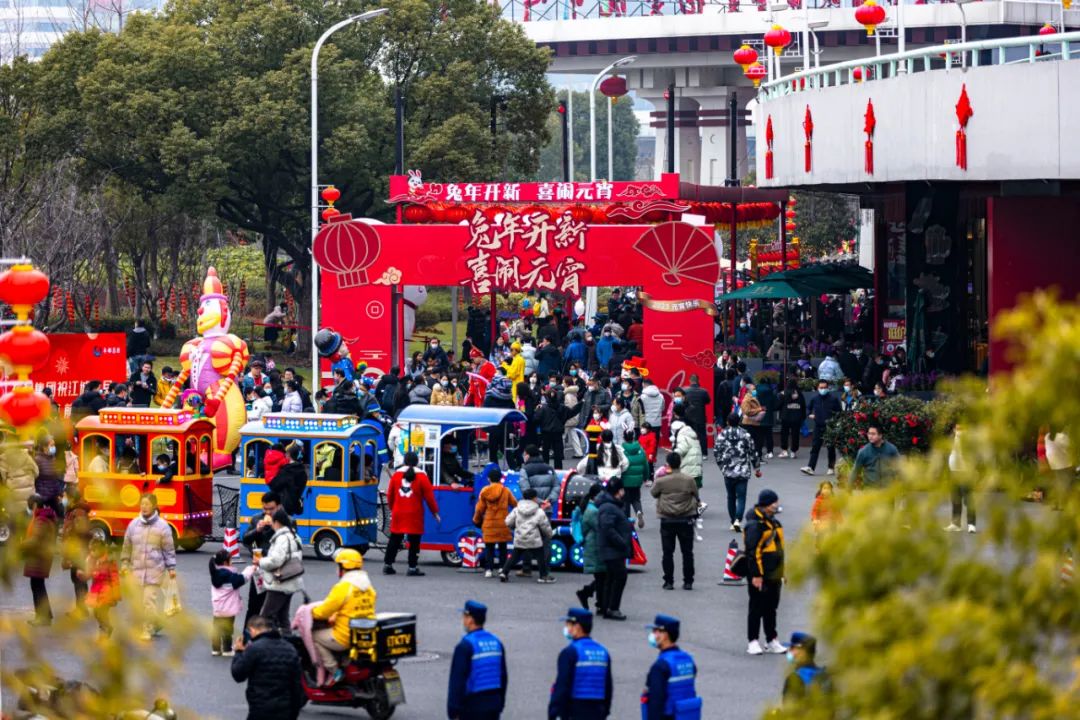 活动现场,大红灯笼隧道点亮夜空,千余盏古风灯笼高高挂起,极具特色的各式灯组和场景设置让人应接不暇,气球、福袋、中国结、各式彩灯飞上枝头,光影流转间恍如梦境。