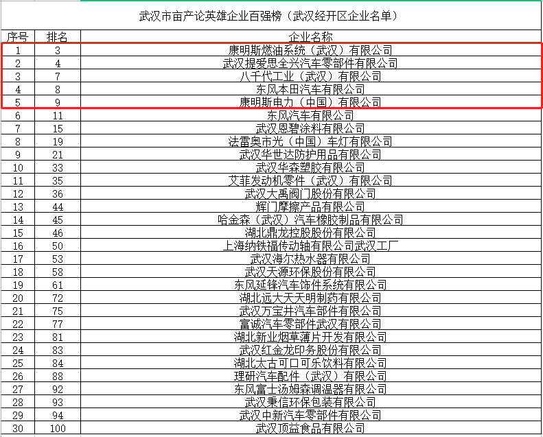 武汉市“亩产论英雄百强榜”前十强企业,武汉经开区企业有5家,它们是康明斯燃油系统(武汉)有限公司、武汉提爱思全兴汽车零部件有限公司、八千代工业(武汉)有限公司、东风本田汽车有限公司、康明斯电力(中国)有限公司。